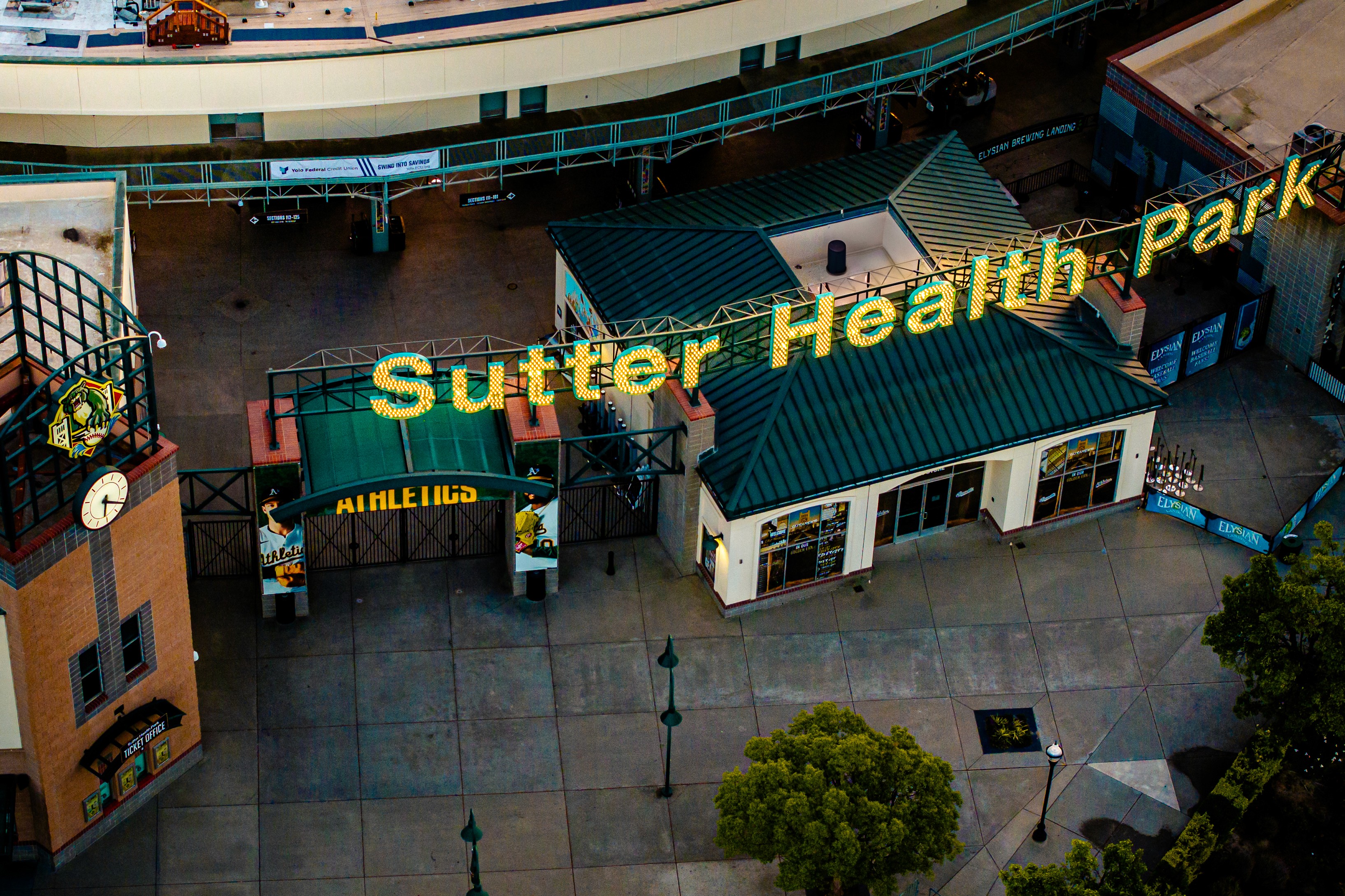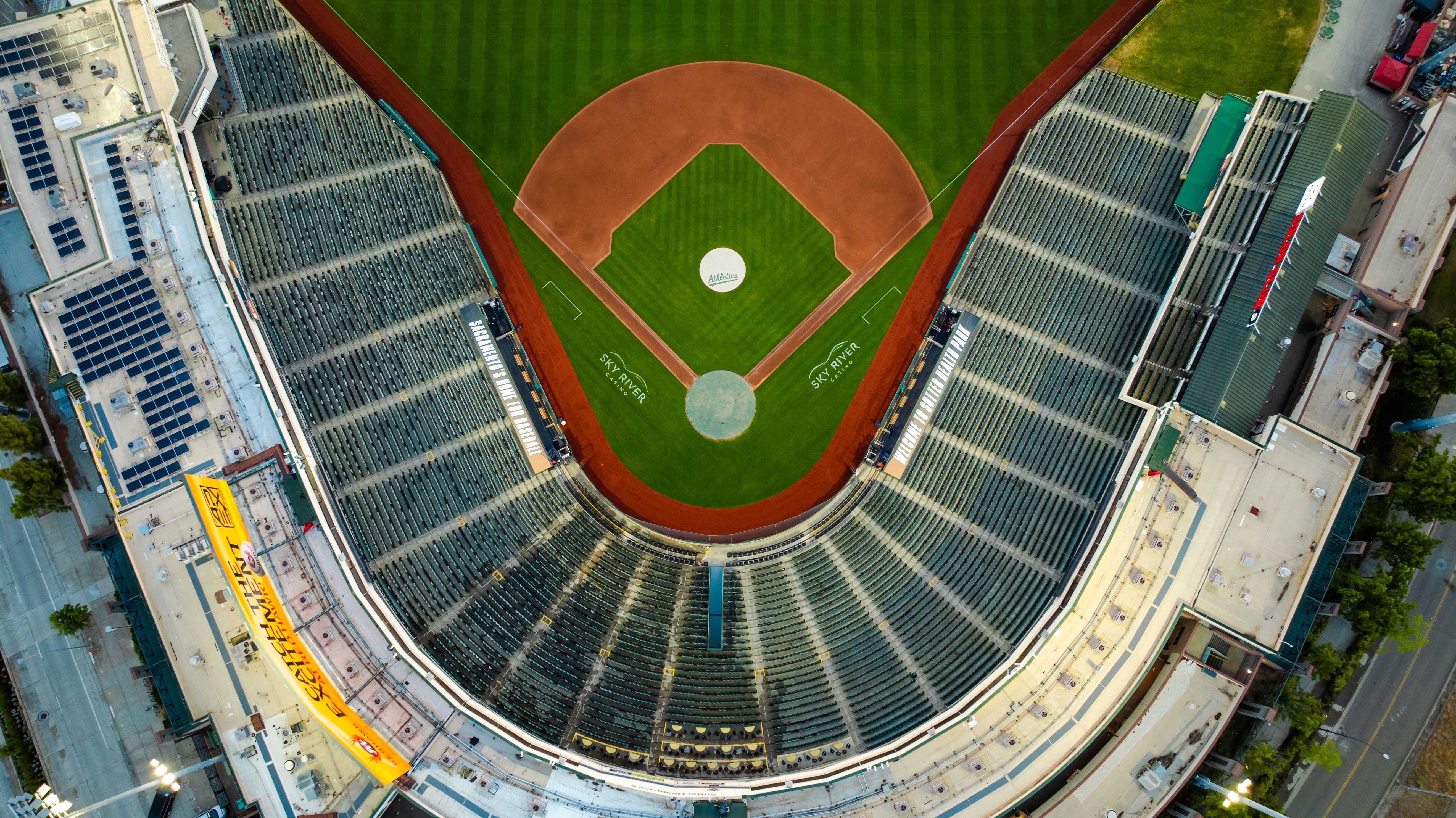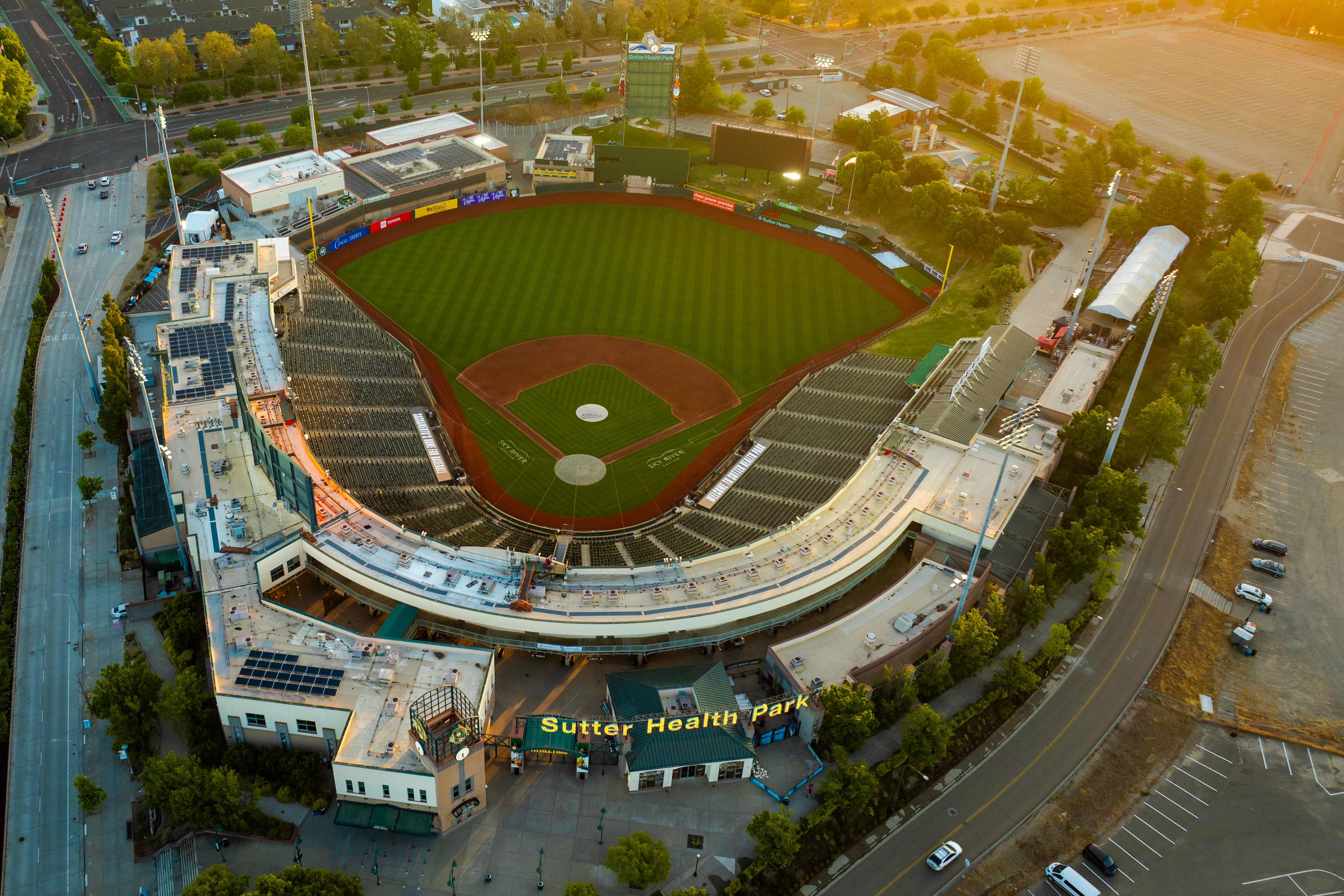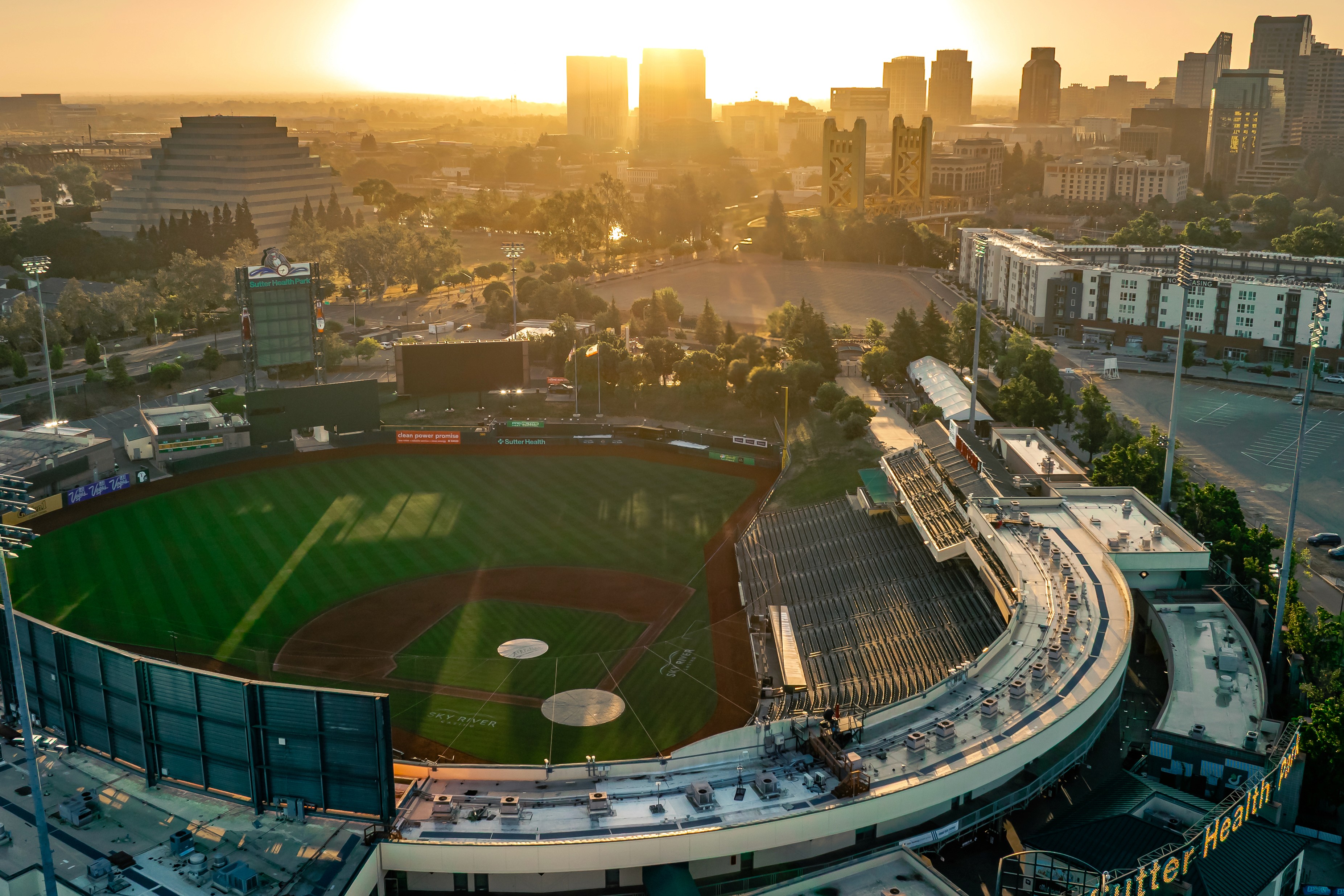 Captured during golden hour, this drone series highlights the Sutter Health Park stadium in downtown Sacramento. Featuring vibrant, top-down and angled compositions, this set emphasizes spatial context, natural light, and local landmark integration.